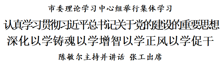 根據(jù)我市主題教育工作安排,市委常委同志認(rèn)真學(xué)習(xí)領(lǐng)會(huì)習(xí)近平總書記關(guān)于黨的建設(shè)的重要思想,關(guān)于嚴(yán)肅黨內(nèi)政治生活的重要講話和重要指示批示精神,關(guān)于以學(xué)鑄魂、以學(xué)增智、以學(xué)正風(fēng)、以學(xué)促干等重要論述,關(guān)于樹立和踐行正確政績(jī)觀的重要論述,學(xué)習(xí)習(xí)近平總書記對(duì)天津工作“三個(gè)著力”重要要求和一系列重要指示批示精神,學(xué)習(xí)黨章、新形勢(shì)下黨內(nèi)政治生活若干準(zhǔn)則、縣以上黨和國(guó)家機(jī)關(guān)黨員領(lǐng)導(dǎo)干部民主生活會(huì)若干規(guī)定等黨內(nèi)法規(guī)。會(huì)上,市委常委同志結(jié)合思想和工作實(shí)際交流了學(xué)習(xí)體會(huì)。